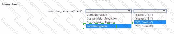 The question context indicates a need to provision an Azure AI service resource, and the answer area highlights the FormRecognizer option. This aligns with document processing scenarios requiring Azure AI Document Intelligence (formerly Form Recognizer).