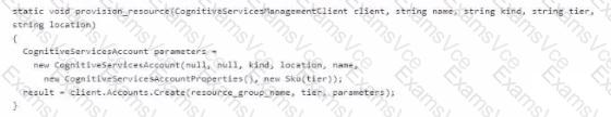 The code snippet shows a helper function provision_resource that provisions Azure Cognitive Services accounts by specifying: