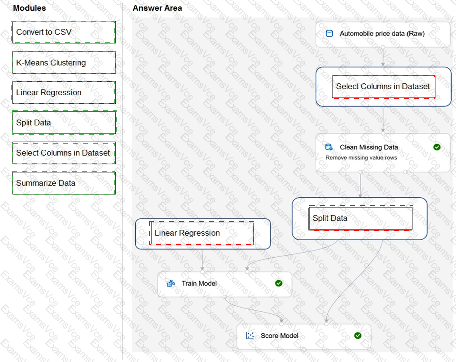 Which type of modules should you use to complete the model? To answer, drag the appropriate modules to the correct locations. Each module may be used once, more than once, or not at all. You may need to drag the split bar between panes or scroll to view content.