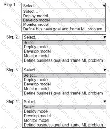 The hotspot provides four steps, each with the same dropdown options: "Select...," "Deploy model," "Develop model," "Monitor model," and "Define business goal and frame ML problem." The correct selections are: