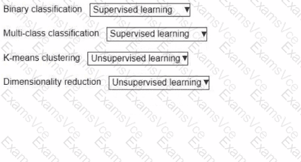 The hotspot lists four use cases, each with a dropdown containing "Select...," "Supervised learning," and "Unsupervised learning." The correct selections are: