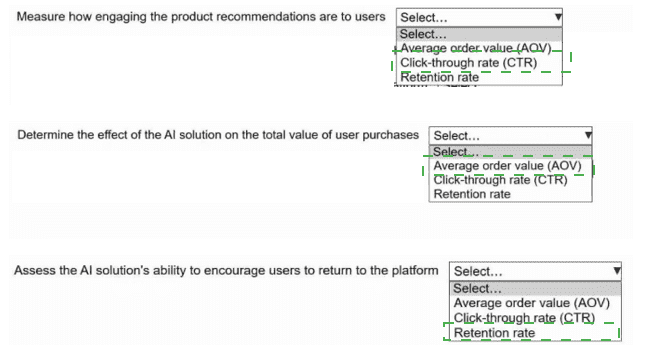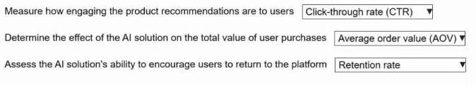 An ecommerce company is developing a generative Al solution to create personalized product recommendations for its application users. The company wants to track how effectively the Al solution increases product sales and user engagement in the application.