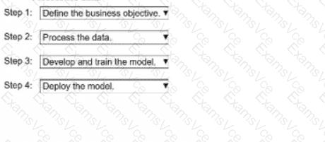 Sated and order the steps from the following bat to correctly describe the ML Lifecycle for a new custom modal Select each step one time. (Select and order FOUR.)