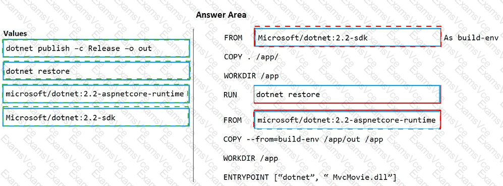 How should you configure the file? To answer, drag the appropriate values to the correct targets. Each value must be used once, more than once, or not at all. You may need to drag the split bar between panes or scroll to view content.