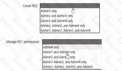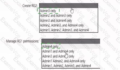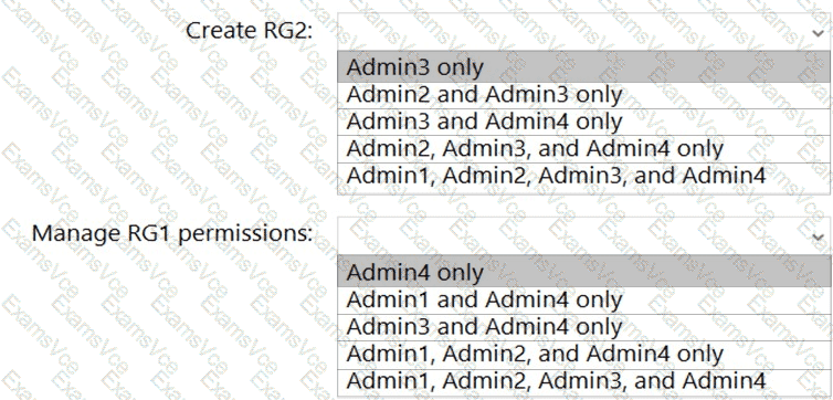 You need to delegate the creation of RG2 and the management of permissions for RG1. Which users can perform each task? To answer select the appropriate options in the answer area. NOTE: Each correct selection is worth one point