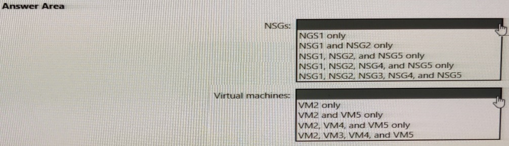 In which NSGs can you use ASG1 and to which virtual machine network interfaces can you associate ASG1? To answer, select the appropriate options in the answer area.