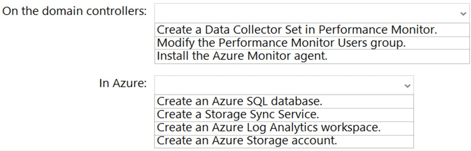 What should you do on the domain controllers, and what should you create on Azure? To answer, select the appropriate options in the answer area.