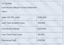 SJ Candles is performing a cost-volume-profit analysis to prepare for year 2. Fixed costs are expected to remain the same as year 1, but variable costs per unit are expected to increase by 10%. They plan to keep the same sales price but want to know what level of sales must be achieved in year 2 to maintain the same operating profit.