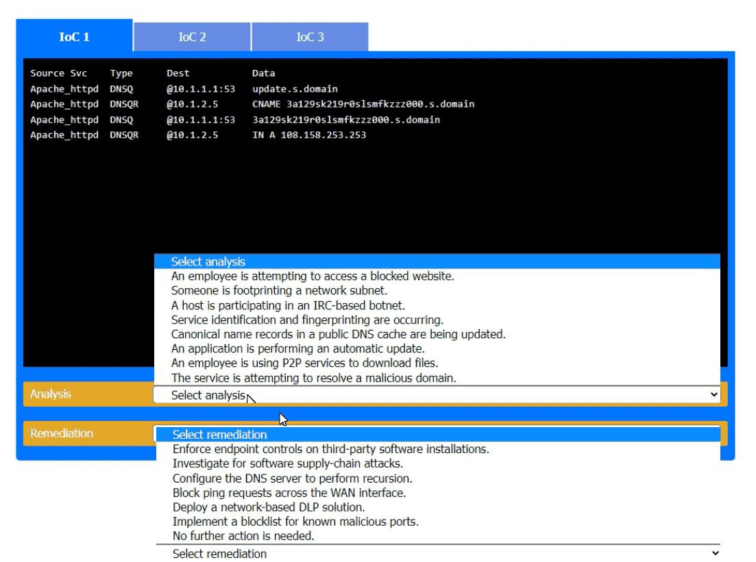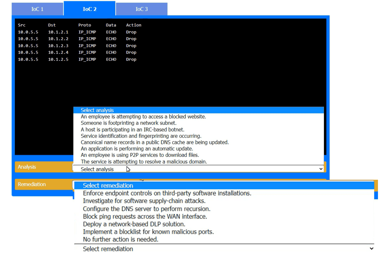 [References:, CompTIA Security+ Study Guide: This guide offers detailed explanations on identifying and mitigating various types of Indicators of Compromise (IoCs) and the corresponding analysis and remediation strategies., CompTIA Security+ Exam Objectives: These objectives cover key concepts in network security monitoring and incident response, providing guidelines on how to handle different types of security events., Security Operations Center (SOC) Best Practices: This resource outlines effective strategies for analyzing and responding to anomalous events within a SOC, including the use of blocklists, endpoint controls, and network configuration changes., By accurately analyzing the nature of each IoC and applying the appropriate remediation measures, the organization can effectively mitigate potential security threats and maintain a robust security posture., , , , , , , , , ]