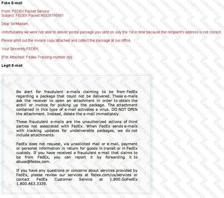 Here is a fraudulent e-mail claiming to be from FedEx regarding a package that could not be delivered. This mail asks the receiver to open an attachment in order to obtain the FEDEX tracking number for picking up the package. The attachment contained in this type of e-mail activates a virus.