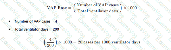 There are four cases of ventilator-associated pneumonia in a surgical intensive care unit with a total of 200 ventilator days and a census of 12 patients. Which of the following BEST expresses how this should be reported?