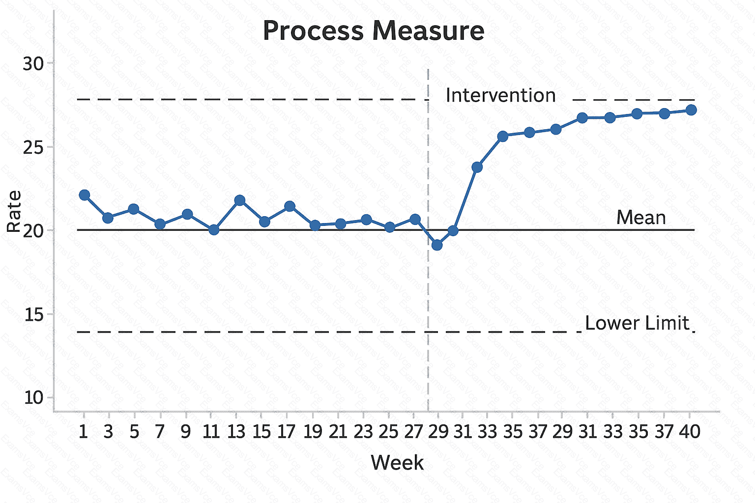 Understanding the Control Chart ComponentsThis control chart shows the median delay over time (by week), with control limits (UCL - Upper Control Limit, LCL - Lower Control Limit) and a center line (CL) indicating the process average before the intervention. Control charts like this one are used to determine whether an intervention has led to a significant change in process performance.