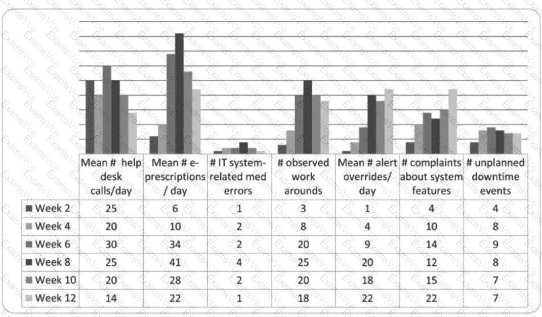 Since the chart is not provided, I’ll base the answer on typical CPHQ scenarios for EHR implementation. The options suggest the chart includes data on e-prescribing stability, system-related medication errors, help desk calls, downtime events, overrides, workarounds, and complaints. Option D, “Overrides, workarounds, and complaints indicate there are underlying barriers to use,” aligns with a common finding in EHR post-implementation reviews. Overrides (e.g., bypassing alerts), workarounds (e.g., using paper notes instead of the EHR), and complaints typically signal usability issues, such as a poorly designed interface, inadequate training, or system inefficiencies. These barriers can lead to errors, staff frustration, and reduced patient safety, requiring targeted interventions like workflow redesign or additional support.