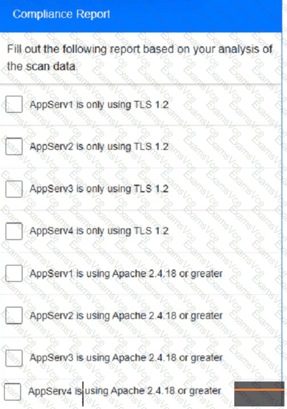 You are a cybersecurity analyst tasked with interpreting scan data from Company As servers You must verify the requirements are being met for all of the servers and recommend changes if you find they are not