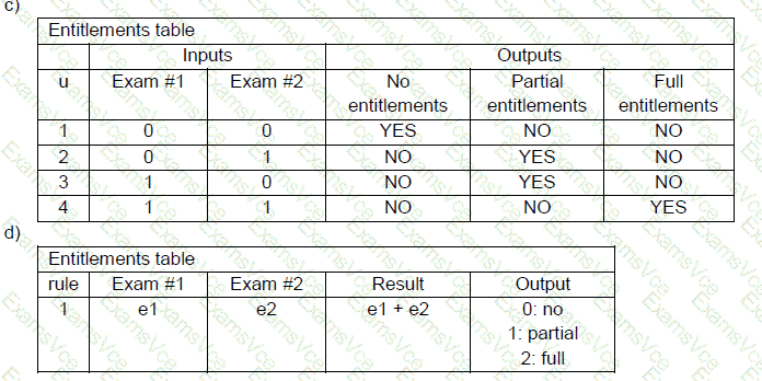 Decision Model and Notation (DMN) is a standardized approach used to model decision logic, often represented in decision tables that evaluate inputs and determine outputs. In this scenario, the entitlements granted to a candidate are based on the total score from two exams, where: