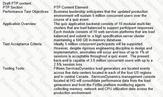 You have been asked to test the performance of a software and system update to a North American mobile trivia quiz game application.The quiz app is available on major app stores serving English-speaking users.The number of concurrent users planned for is 5 million Winning quiz participants are promised a share of an allocated cash prize Once participants start playing, their quiz sessions must not be lost especially if all previous questions were answered correctly. The application owner wants to ensure that 99% of quiz sessions are maintained (up to 4.95 million sessions) until the last answer has been successfully recorded.
