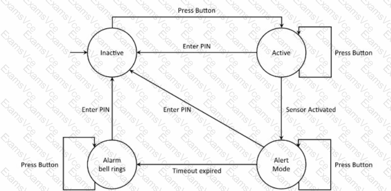 An anti-intrusion system is battery powered and is activated by pressing the only available button. To deactivate the system, the operator must enter a PIN code. The system will stay in alert mode within a configurable timeout and an alarm bell will ring if the system is not deactivated before the timeout expires. The following state transition diagram describes the behavior of the system: