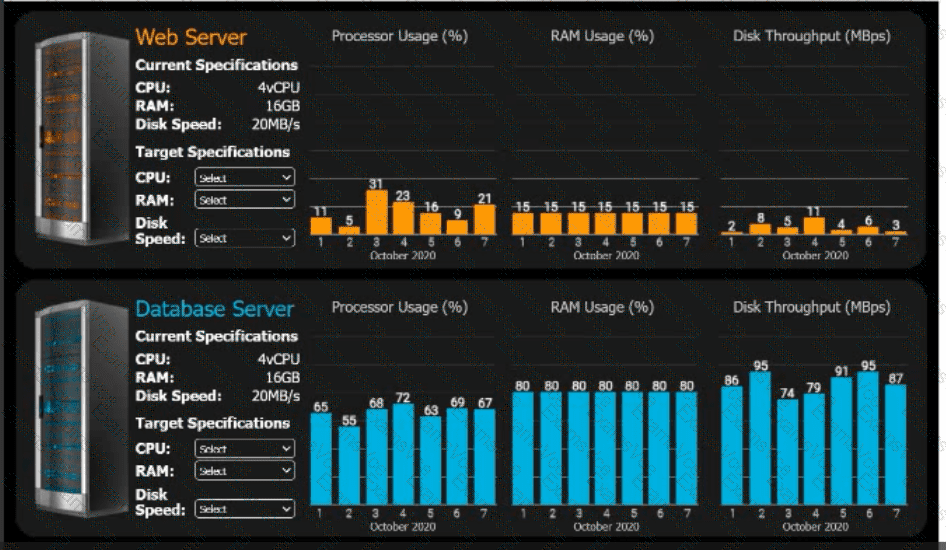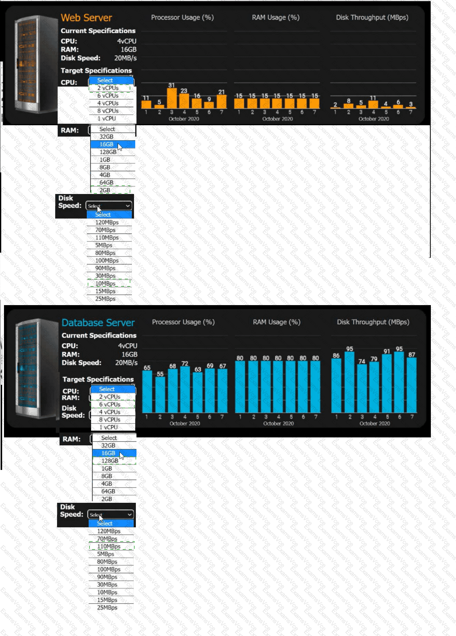 Review the specifications and graphs showing resource usage for the web and database servers. Determine the average resource usage and select the correct specifications from the available drop-down options.