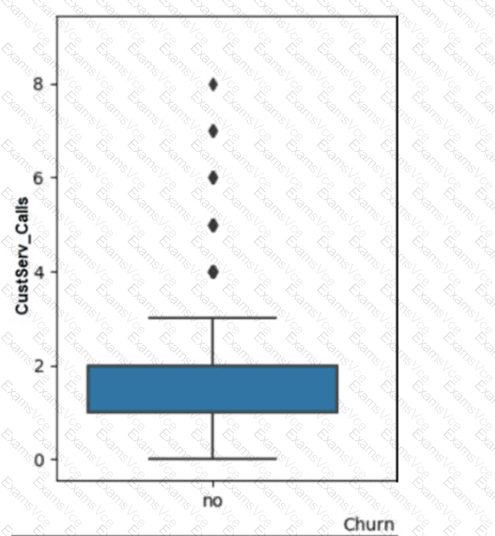 The image below shows a box plot graph with a vertical axis labeled “Customer Calls” and a horizontal axis labeled “Churn”. The box plot is blue in color and the median value is around 2. There are 7 outliers above the box plot, ranging from 4 to 8.