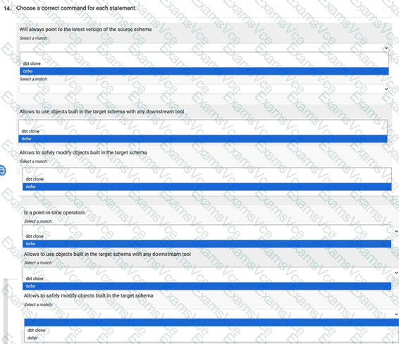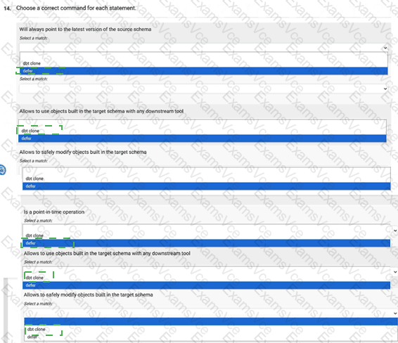 By contrast, dbt clone creates a point-in-time copy of existing relations. This cloned schema is static; it does not auto-update when source data changes. Therefore, clone is classified as a “point-in-time operation.” Since clone copies physical tables/views into a new schema, downstream tools (BI dashboards, ML pipelines) can safely query the cloned environment without affecting production, making “allows to use objects built in the target schema with any downstream tool” the correct match.