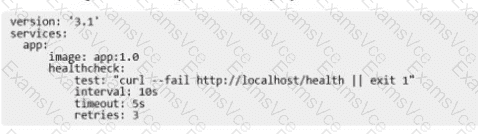 Solution.Health checks lest for app health ten seconds apart. Three failed health checks transition the container into "unhealthy" status.