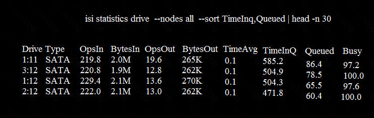 An administrator is investigating the performance of one of their Dell EMC Isilon clusters. Using the isi statistics drive command, the performance of the first five drives is shown.