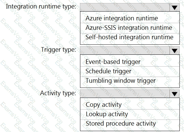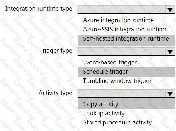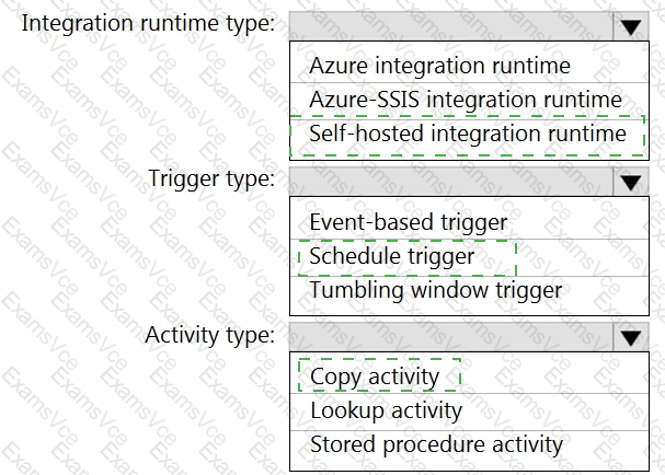 Which Azure Data Factory components should you recommend using together to import the daily inventory data from the SQL server to Azure Data Lake Storage? To answer, select the appropriate options in the answer area.
