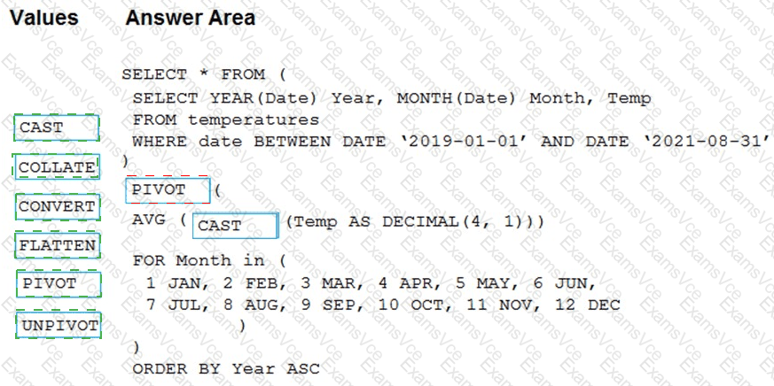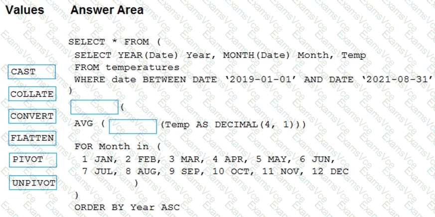 How should you complete the query? To answer, drag the appropriate values to the correct targets. Each value may be used once, more than once, or not at all. You may need to drag the split bar between panes or scroll to view content.