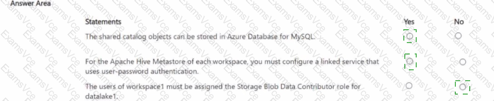 You plan to configure each Spark pool to share catalog objects that reference datalakel For each of the following statements, select Yes if the statement is true. Otherwise, select No. NOTE Each correct selection is worth one point.