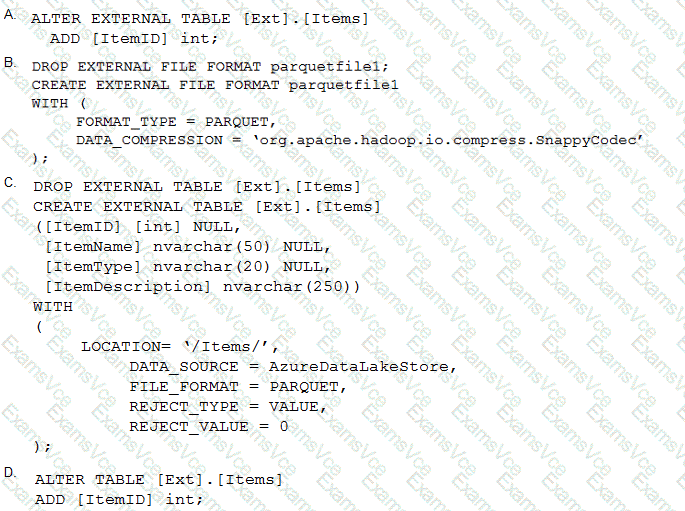 Using PolyBase, you create an external table named [Ext].[Items] to query Parquet files stored in Azure Data Lake Storage Gen2 without importing the data to the data warehouse.