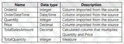 You have a Fabric tenant that contains a semantic model named Model1. Model1 uses Import mode. Model1 contains a table named Orders. Orders has 100 million rows and the following fields.