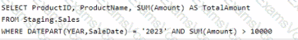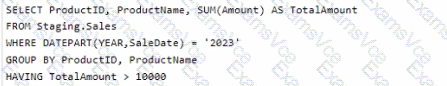 You need to write a T-SQL query that will return data for the year 2023 that displays ProductID and ProductName arxl has a summarized Amount that is higher than 10,000. Which query should you use?
