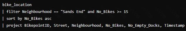 You need to apply transformation and filter logic to prepare the data for consumption. The solution must return data for a neighbourhood named Sands End when No_Bikes is at least 15. The results must be ordered by No_Bikes in ascending order.