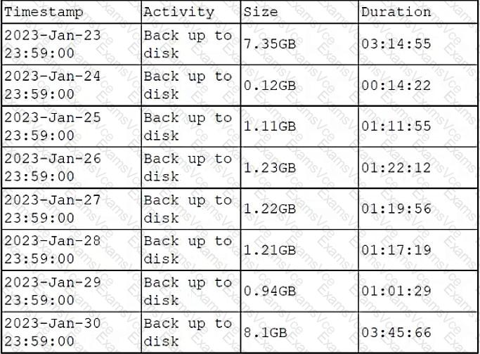 A DBA is reviewing the following logs to determine the current data backup plan for a primary data server: