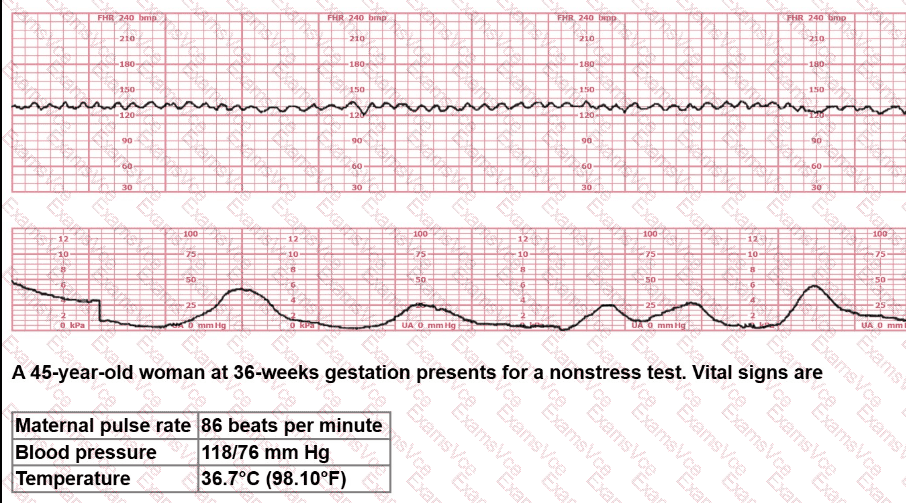 A 45-year-old woman at 36-weeks gestation presents for a nonstress test. Vital signs are:
