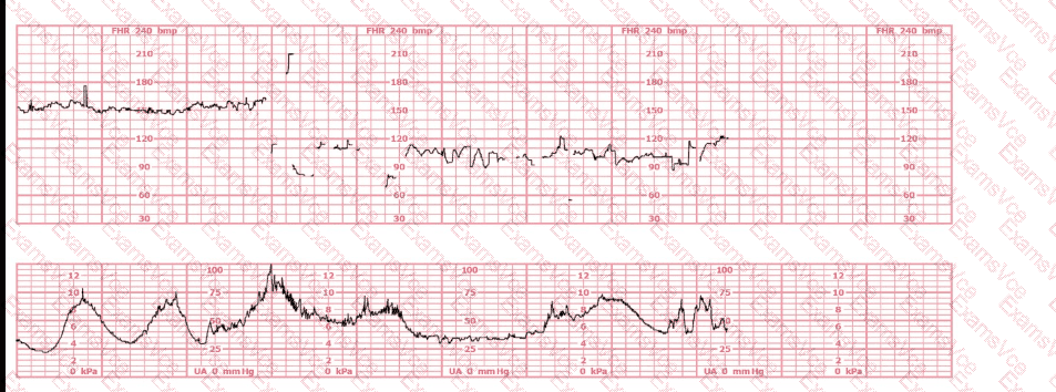 A woman at 39-weeks gestation is in early labor, 2–3 cm dilated, 85% effaced, and –2 station. Based on the fetal heart rate tracing shown, what is the most appropriate first intervention?