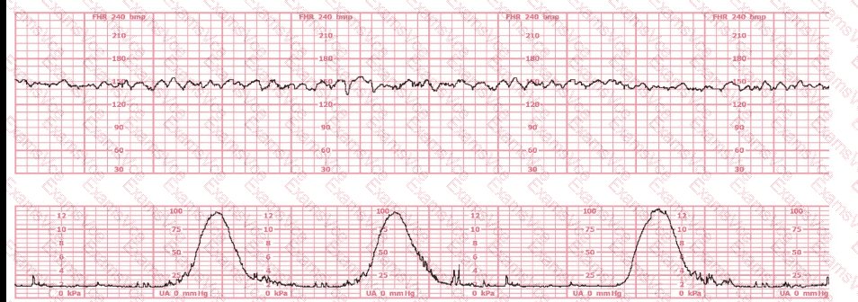 The fetal heart rate (FHR) tracing shown demonstrates a baseline approximately 135–145 bpm with fluctuations of 6–25 bpm, a hallmark of moderate variability. Moderate variability is defined in all NCC-endorsed resources as the normal amplitude range of 6–25 bpm around the fetal baseline.
