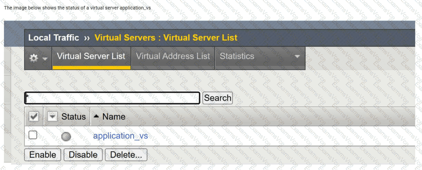 The exhibit shows the virtual serverapplication_vswith a status indicating it isoffline but enabled. In BIG-IP terminology, this status means the virtual server itself is administratively enabled, but it is unable to pass traffic becauseno usable pool members are available.