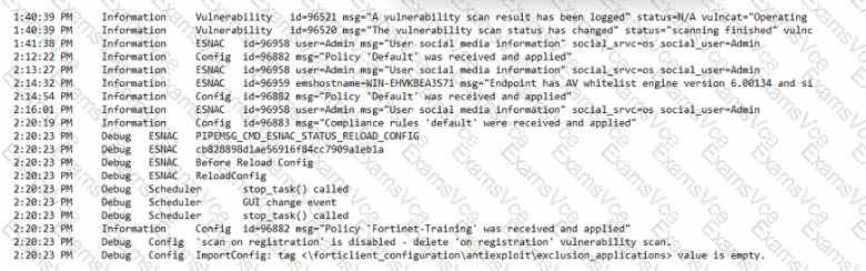 Based on the FortiClient logs shown in the exhibit, which endpoint profile policy is currently applied lo the ForliClient endpoint from the EMS server?