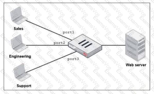 FortiGate has two separate firewall policies for Sales and Engineering to access the same web server with the same security profiles.