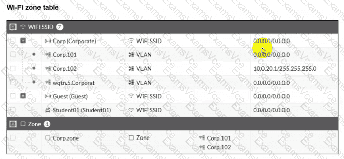 B is incorrect — Corp.zone contains both Corp.101 and Corp.102. Since Corp.101 has no IP configured (0.0.0.0/0.0.0.0), clients on Floor_1 APs (VLAN 101) will not receive any IP address, let alone one from the 10.0.20.0/24 subnet. Only Corp.102 clients (Office group) receive addresses from 10.0.20.0/24.