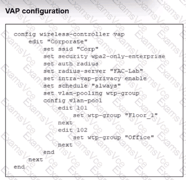 Why D is CORRECT: The VAP configuration explicitly maps wtp-group " Office " to VLAN 102. The study guide confirms that with the Managed AP Group method, VLANs are assigned based on AP group membership. APs belonging to the " Office " group will have all their clients assigned to VLAN 102 (Corp.102), which has a configured IP of 10.0.20.1/255.255.255.0 — confirming option D.