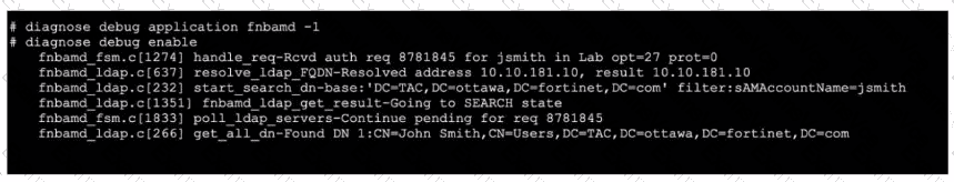 “An fnbamd_ldap_build_dn_search_req-base message indicates that FortiGate is performing step two: searching for the user in the LDAP tree.” It also says that if the LDAP server finds the user, the output shows the user’s full DN.