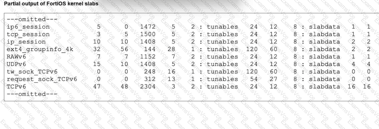 The partial output of FortiOS kernel slabs is shown. Which statement about total slab size is true?