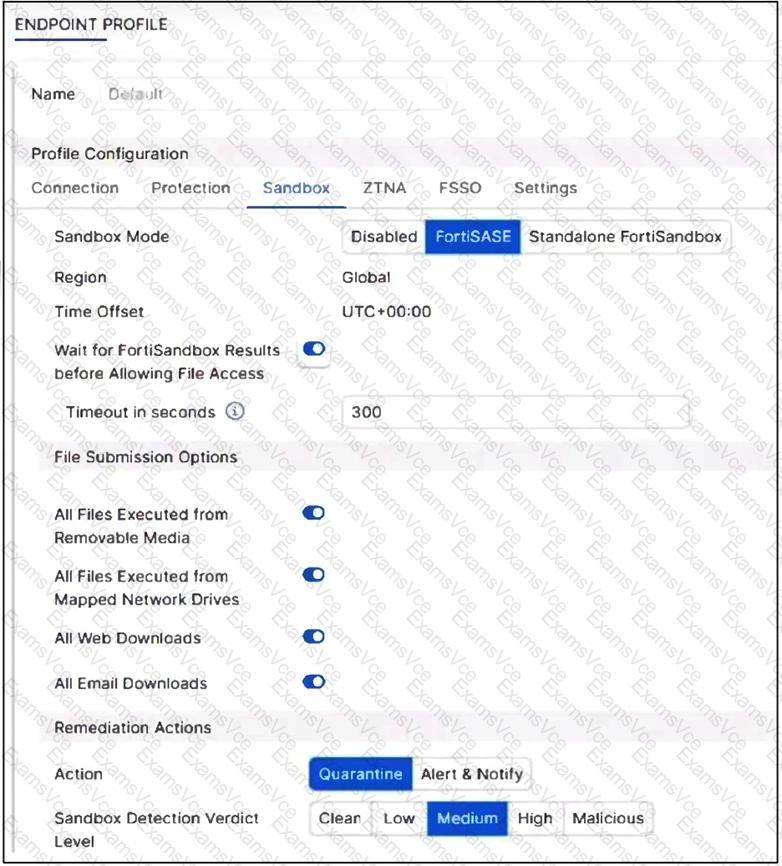 Based on the configuration shown, in which two ways will FortiSASE process sessions that require FortiSandbox inspection? (Choose two.)