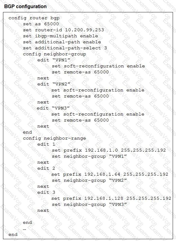 The exhibit shows the BGP configuration on the hub in a hub-and-spoke topology. The administrator wants BGP to advertise prefixes from spokes to other spokes over the IPsec overlays, including additional paths. However, when looking at the spoke routing table, the administrator does not see the prefixes from other spokes and the additional paths