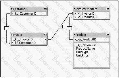 Your database has four tables: Customer, Invoice, Line Item, and Product. The relationships are displayed in the Relationships Graph exhibit.