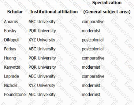 When an article is submitted, the editor has the article peer-reviewed by exactly three experts, none of whom authored or coauthored the article. The table (see the Reviewers/Authors tab) consists of all the authors or coauthors who have recently submitted articles and all the experts who currently peer-review or have recently peer-reviewed those articles. It also lists the general subject areas for each of the authors and reviewers.