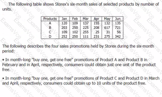 To increase sales, Storex, a department store, held month-long sales campaigns to promote four of its products. A sales promotion was considered successful if unit sales of the product were at least 10% higher in each of the 2 calendar months immediately following the promotion than In the month preceding it.