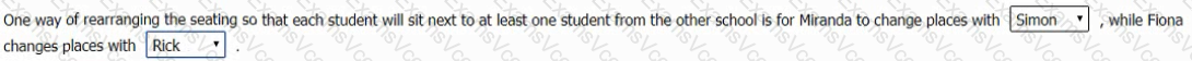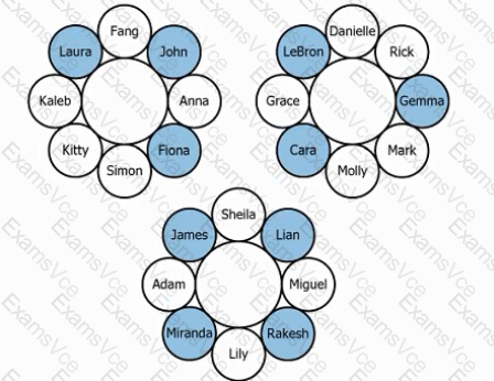 The diagram shows the proposed seating assignments at a meeting of students from two schools that are to engage in a Joint science project. Each of the three large circles represents a table. Small blue circles represent students from School X and small white circles represent students from School Y.